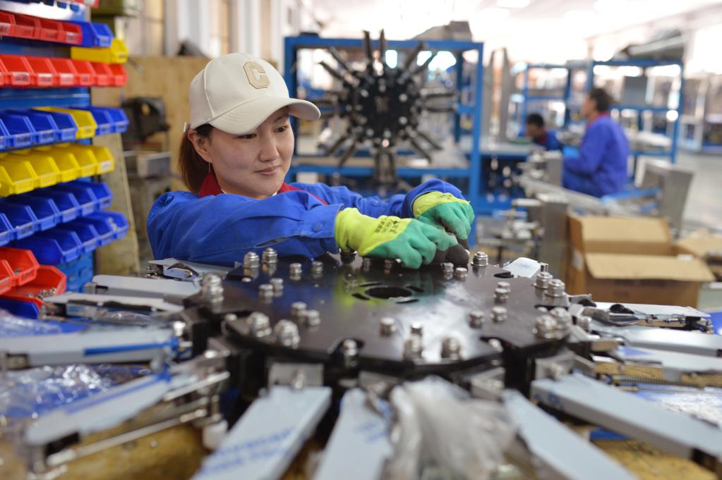 3月30日,在山东省青岛市城阳区夏庄街道青岛义龙装备制造股份有限公司生产车间内,工人在组装包装机。新华社发(王海滨 摄)