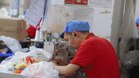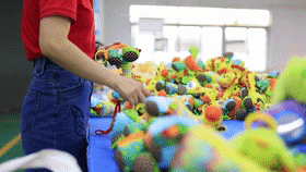 车间另一头,品检组组长梁建敏正给玩具成品审核把关。梁建敏很瘦,但很有能量,拖货、倒货、检查货,好像总有使不完的力气,脸上总是挂着阳光般的笑容,眼睛里充满对工作的热忱。她验货时不单用眼睛,还会把毛绒玩具贴近耳朵来听。