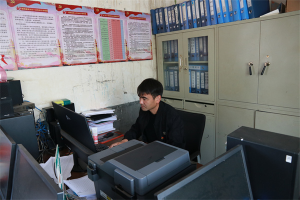 杨启云在下坝村村民委员会办公室内查阅资料。
