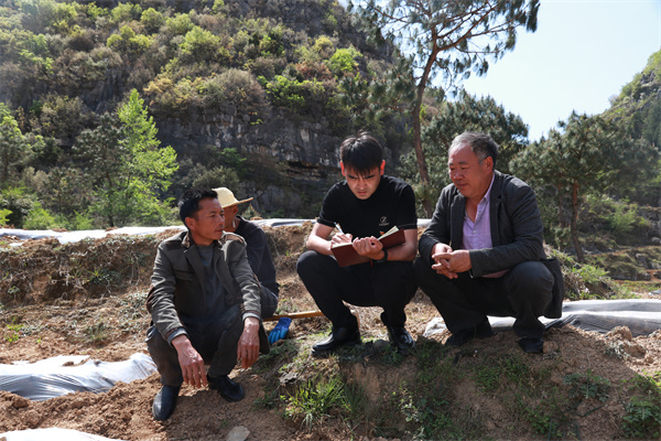 杨启云(右二)在田间与村干部交流了解产业情况。