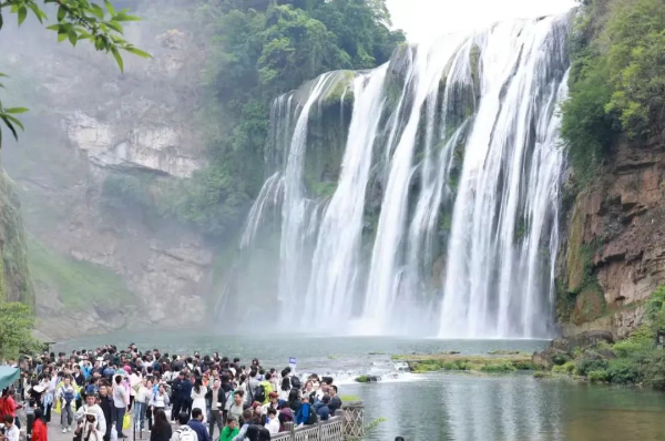 “五一”假期,黄果树景区人流如织,游客穿梭在景区各处,大瀑布前人潮涌动,奔腾的水流飞泻而下,气势磅礴,巨大的轰鸣声震耳欲聋,引得游客们纷纷驻足,拿出相机、手机记录这震撼人心的瞬间。