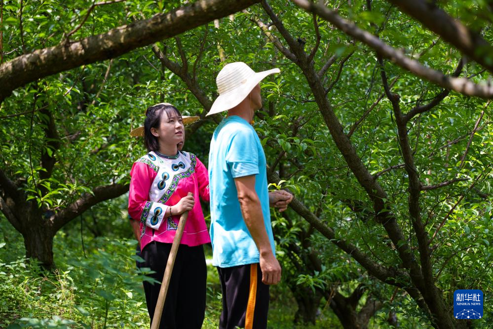 5月8日,卢丹在致富村的果园内和村民一起研究李子树管护技术。新华社记者 刘续 摄