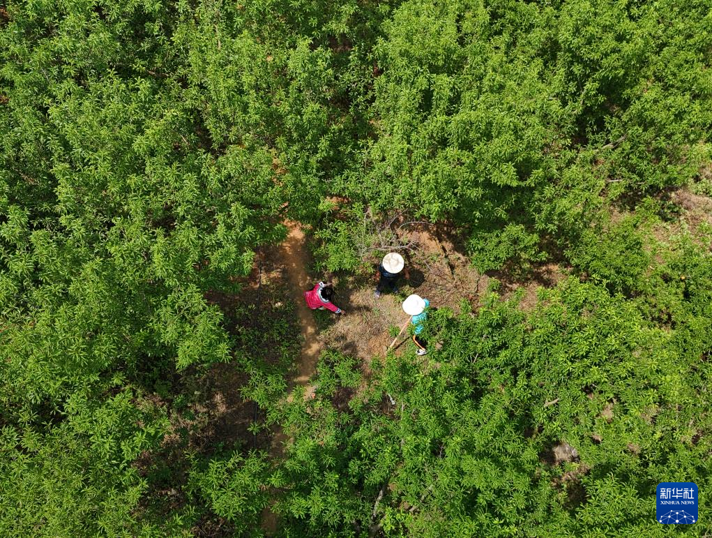 5月8日,卢丹在致富村的果园内和村民一起清除杂草(无人机照片)。新华社发(郭佳丽 摄)