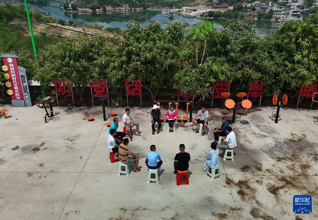 5月8日,卢丹在致富村向村民宣讲两会精神(无人机照片)。新华社记者 刘续 摄