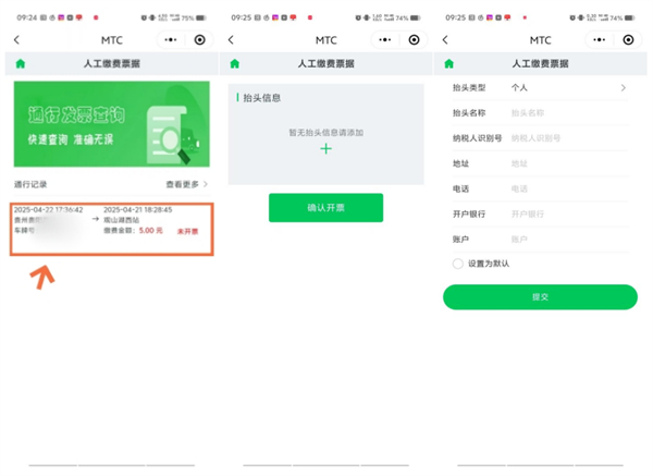 选择需要开票的通行记录,点击【+】号,添加发票抬头信息并【提交】: