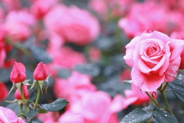 微风吹拂,繁茂的月季花如同波浪般起伏,各色花 朵交织成一幅流动的油画。