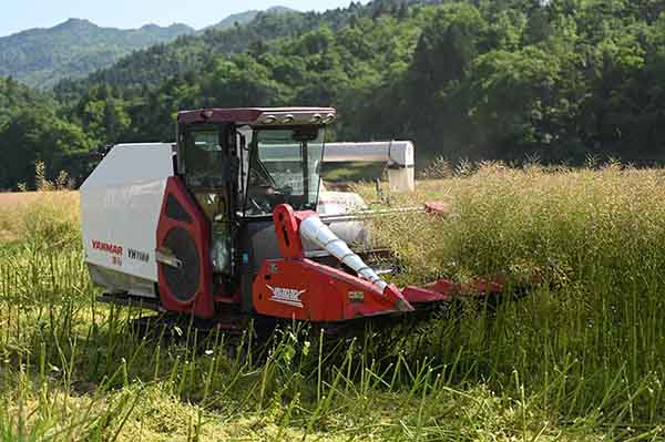在寨英镇罗家寨村“稻-油”轮作种植基地,到处是金黄色的油菜。一台收割机忙碌在田间,不时传来轰隆隆的声响,收割机所到之处,不仅把油菜收割好,同时把油菜杆粉碎还田。村民把收割好的油菜籽进行晾晒、去杂质后榨油。