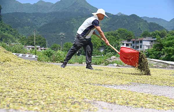 5月12日,松桃苗族自治县寨英镇罗家寨的村民在晾晒油菜籽。(谢慧芳 摄)
