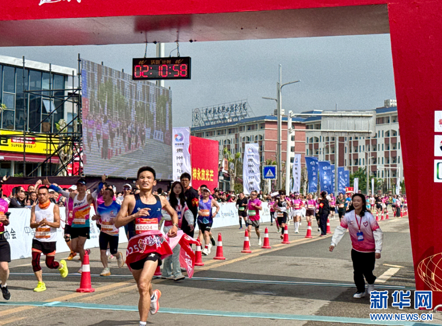 5月11日,全程马拉松项目男子组第一名跑向终点。新华网发(许然 摄)