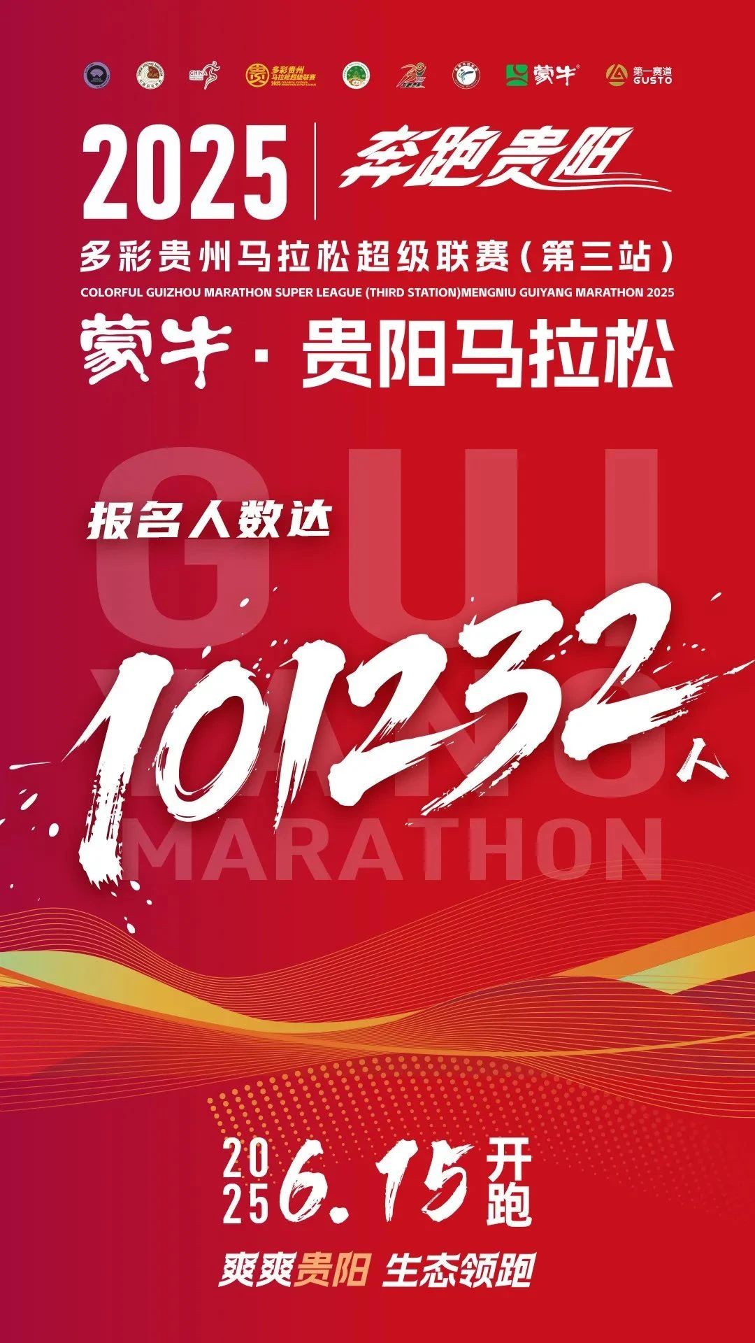 2025多彩贵州马拉松超级联赛(第三站)暨蒙牛·贵阳马拉松于4月29日14时启动报名至5月12日18时报名通道关闭,共计101232人报名“贵马”,抽签结果将于5月15日10时公布。据了解,2025年贵阳马拉松赛将于6月15日鸣枪开跑,设置马拉松、半程马拉松、十公里、迷你跑四大项目,赛事总规模达3.5万人,为历史新高。(李涛涛)