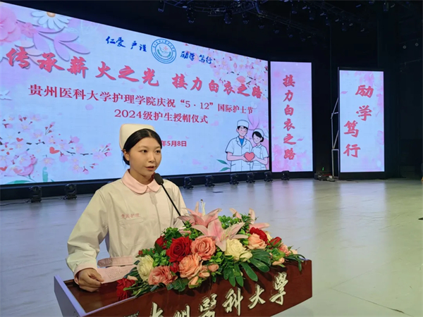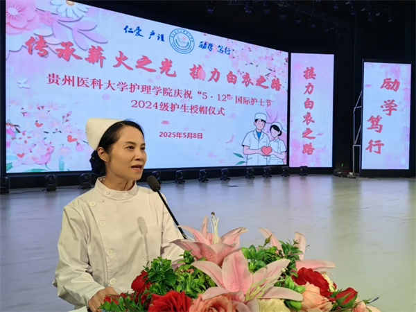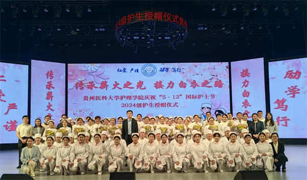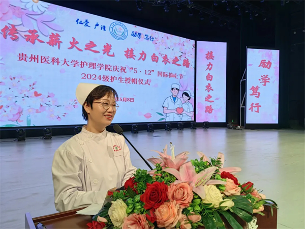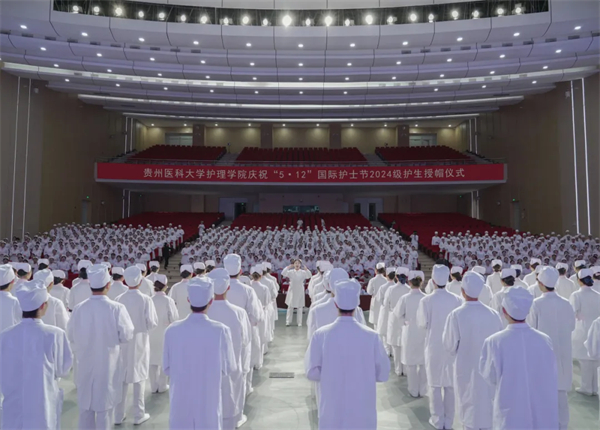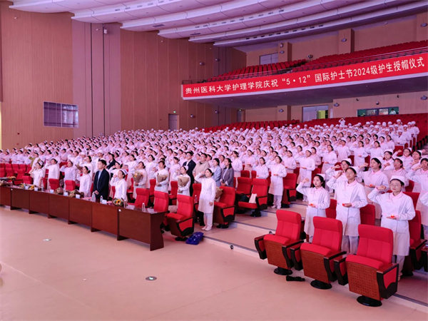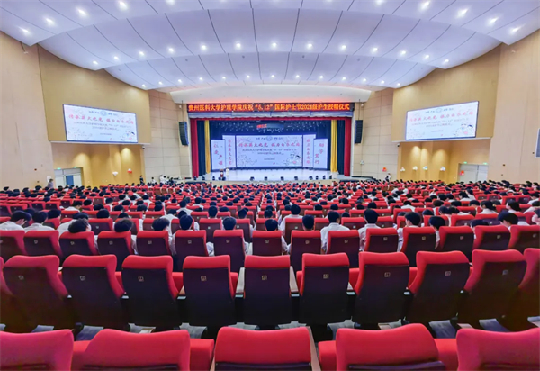 为传承南丁格尔精神,激励护理学子逐梦前行,在第114个国际护士节到来之际,贵州医科大学护理学院在云漫湖校区礼堂隆重举办以“传承薪火之光,接力白衣之路”为主题的2025年“5·12”国际护士节庆祝活动暨2024级护生授帽仪式。活动邀请中山一院贵州医院(贵医附院贵安院区)护理部副主任汤晋、贵州省职工医院护理部副主任周小梅等24位优秀护理前辈为715名护生授帽传烛。学院领导班子、护理学院教职工及2024级学生参加本次授帽仪式。