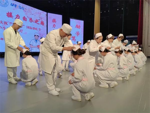 在悠扬的《星空》旋律中,授帽仪式正式拉开帷幕。护生们身着白衣,手捧燕帽,依次上台接受前辈授予的护士帽。