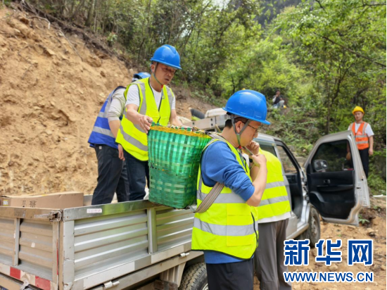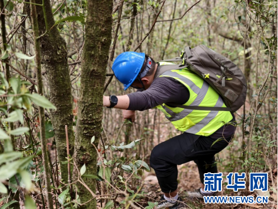 “数字先锋队”队员在陡峭山间进行基站选址勘测。新华网发