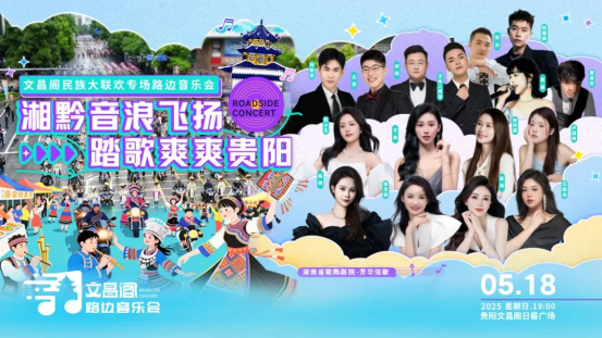 5月18日19时,将举办“湘黔音浪飞扬 踏歌爽爽贵阳”文昌阁民族大联欢专场路边音乐会。这场盛会以“文化为魂、音乐为媒、创新为翼”,深度融合传统民族文化与现代艺术,让历史底蕴与城市活力交相辉映!