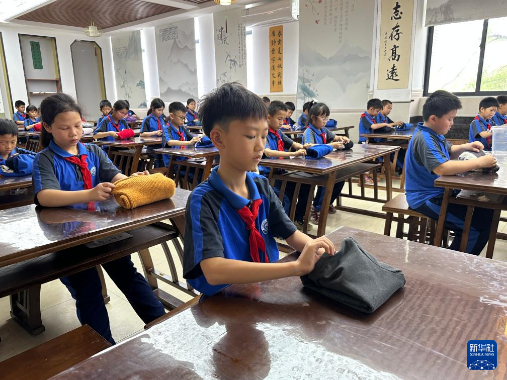 广州市增城区增江小学劳动课堂上,孩子们学习叠衣服。新华社记者杨淑馨 摄