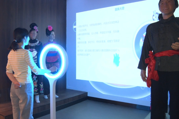 黔东南州丹寨苗族文化博览馆讲解员张欣分享道:“我们讲解员会身穿苗族服饰,讲解我们苗族文化博览馆的蚩尤历史事迹,以及苗族远古社会背景,通过微缩雕塑背景图、实物展台以及动态叠加影像的方式,让观众沉浸式地体验我们的苗族文化。”
