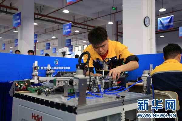 贵州省第二届职业技能大赛比赛期间,选手在调试设备。新华网 李涛涛 摄
