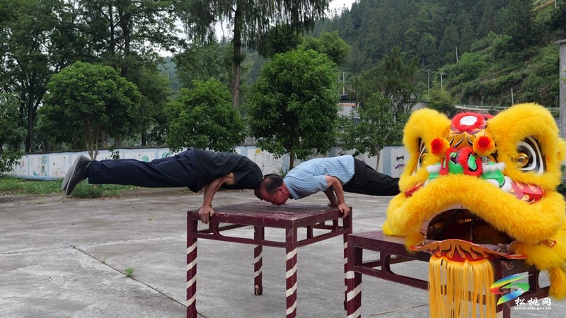陈应贵生活的永安乡,舞狮文化源远流长,始于1888年,活跃在印江、秀山、沿河等毗邻县,在继承和创新中已积淀了地面和高空两块表演方阵。地面表演主要有:抹四角、沿河吃水共14套动作;高空表演主要有:雄鹰展翅、桌脚倒立、蜘蛛牵丝共10套动作。