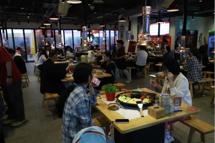 民生路好吃街内另一家美食店铺,大黔烙锅店内顾客们早已开始品尝美食了。“我们早上正常营业时间是早上9点半到晚上11点,但因为今天大巡游的原因,我们闭店时间延迟到了凌晨1点。同时,店内临时找了5名兼职人员,加上本身的15名工作人员才勉强能为顾客们带来较为周到的服务。”大黔烙锅店主彭敏说“五一”期间店内客流量达到了一次高峰,加上今天大巡游的加持,客流量较往常也增加了20%-30%左右,备货量也是之前的1.5倍,希望今天结束后营业额能翻2、3倍。