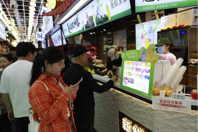 与此同时,民生路好吃街内贵阳冰浆店工作人员也在忙碌着。“针对此次民族巡游,我们今天的营业时间由平时的早上9点到晚上11点,调整到了早上8点到晚上12点,随后也会根据人流量去继续调整营业时间。”工作人员杨思仪说,“冰浆备货量提前准备了4至5倍,店内人手也增加了2名,并安排了部分工作人员带产品给市民游客们试吃,让大家感受到我们云岩的热情”。