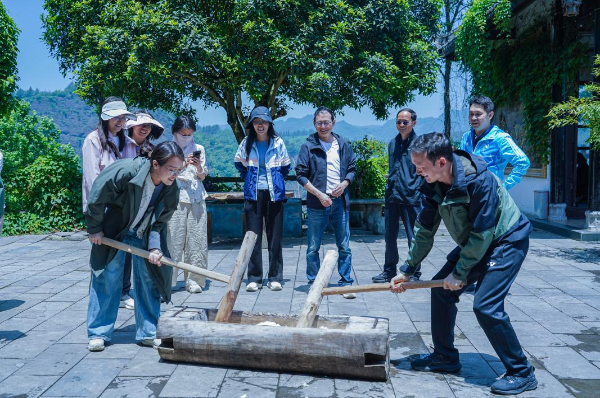采茶结束后,打糍粑环节将活动氛围推向高潮。木臼、木杵准备就绪,职工们两两轮番上阵,合力挥动木杵,有节奏地捶打着糯米饭。随着此起彼伏的“嘿哟”声,原本松散的米粒逐渐变得软糯绵密。热气腾腾的糍粑裹上香甜的黄豆粉和白糖,咬上一口,甜蜜与幸福在舌尖蔓延,也让大家感受到传统美食的独特魅力。