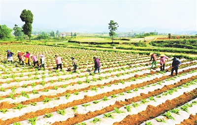 图为陆坪镇罗坳村烟农在为烟苗培土。(易盛武 摄)