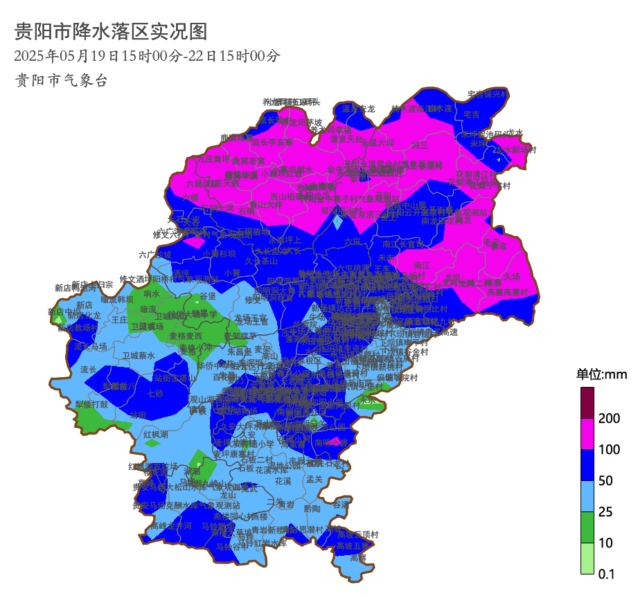 据贵阳市气象台统计,在5月19日15时到22日15时时间段内,贵阳市北部息烽县、开阳县、修文县累计雨量超过120毫米的站点就有30站,其中息烽县16站、开阳县13站、修文县1站。超过200毫米的站点均在息烽,其中小寨坝气象观测站达到228.4毫米。