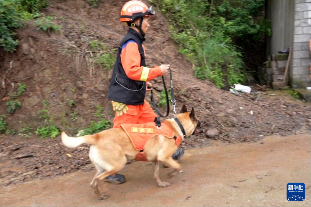 因强降雨造成道路塌方,消防救援人员携带搜救犬徒步赶往救援现场。(贵州消防供图)