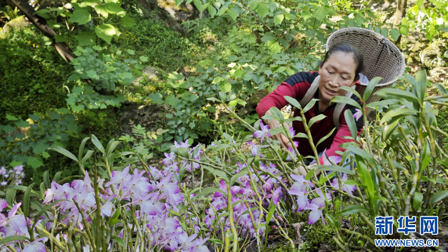 在赤水市葫市镇天堂村,村民在采收金钗石斛花。新华网发(张浪摄)