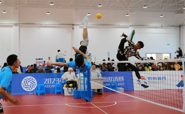 藤球运动是新加坡、马来西亚、印度尼西亚等国家的传统体育项目,在东南亚地区广泛流行。藤球是一项运用脚腕、膝关节等部位同时夹、顶球,不让球落地的运动,类似我国民间的踢花毽子。