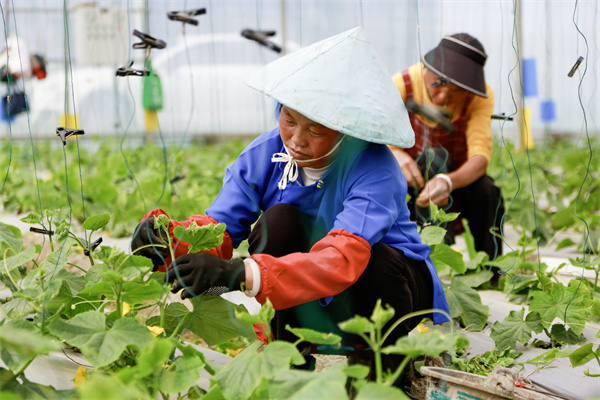 采摘、分拣、装箱……在黔南布依族苗族自治州龙里县湾滩河镇现代高效农业示范园区黄瓜基地,300余名务工群众来回穿梭,把一个个青翠欲滴的黄瓜摘离瓜藤,准备送至1000公里外的粤港澳大湾区,预计一天左右到达。