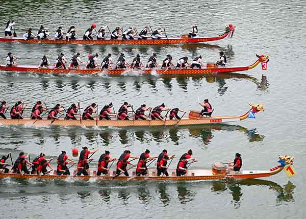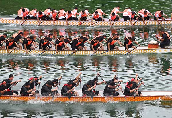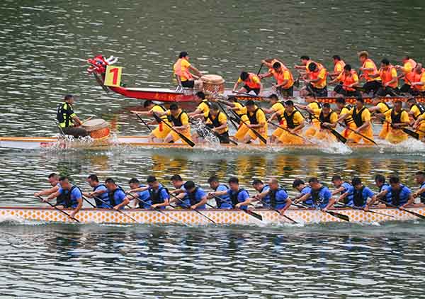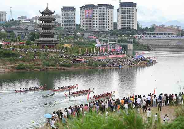 5月31日,农历五月初五,贵州省铜仁市松桃苗族自治县举行一年一度的龙舟比赛。60余支龙舟队伍劈波斩浪展开角逐,活动现场气氛热烈,呈现了一场热闹的水上盛宴,吸引许多市民游客前来观赏。(谢慧芳)