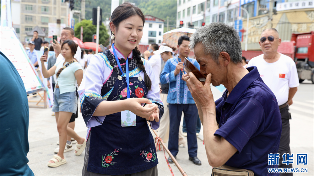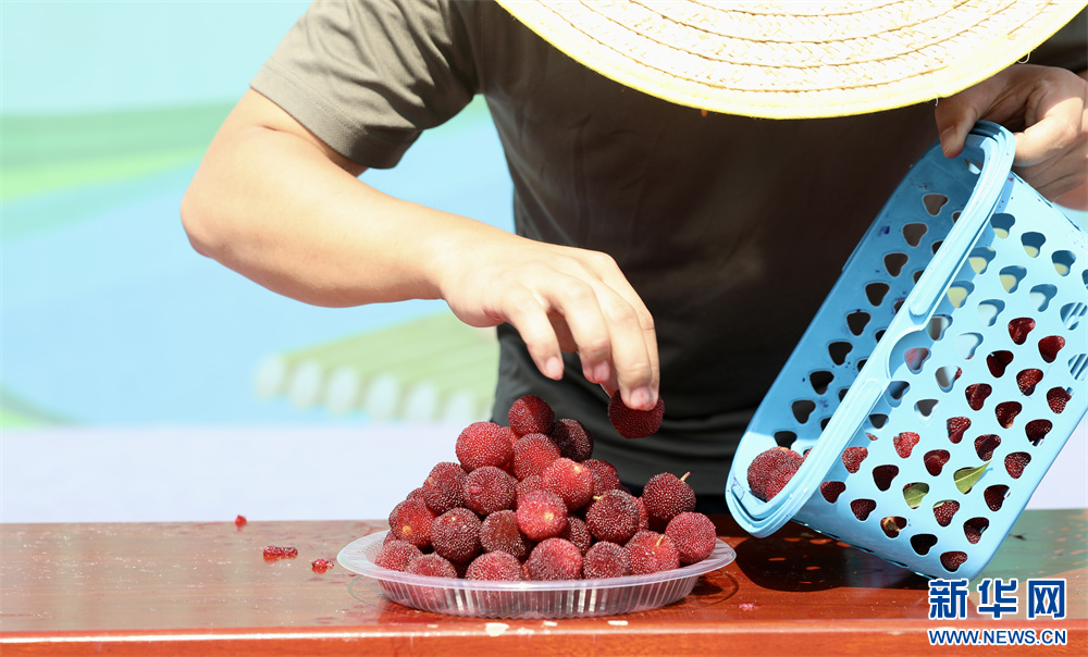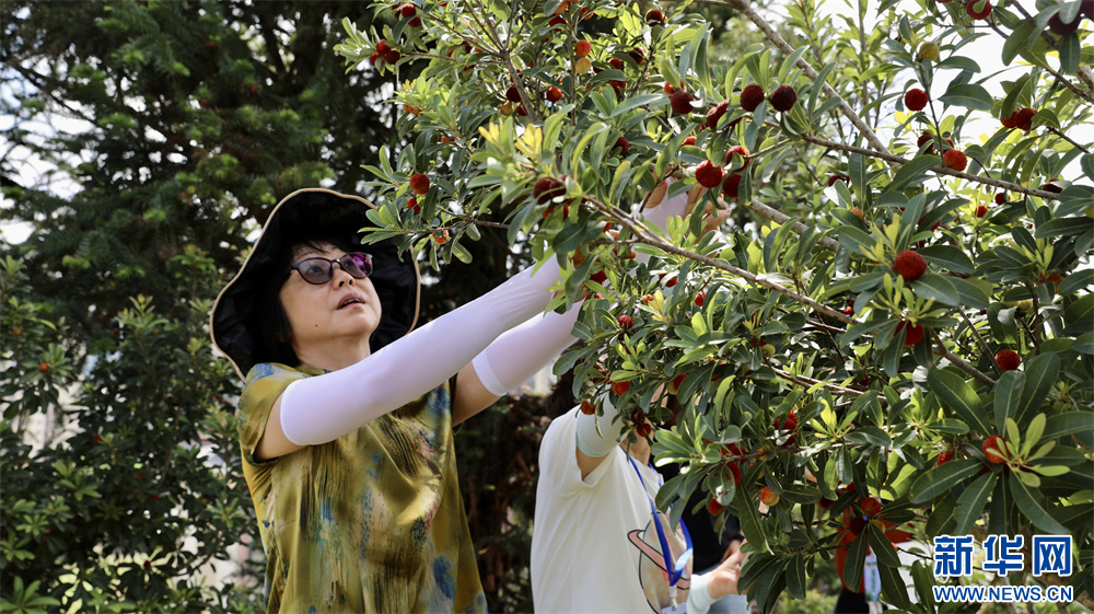 6月1日,工作人员邀请村民品尝杨梅酒。新华网发(石建生摄)