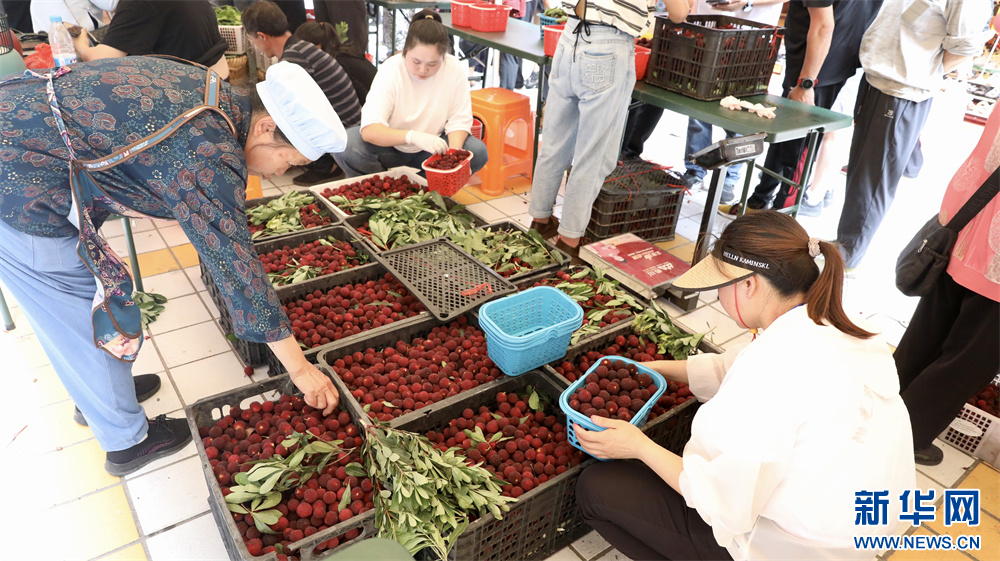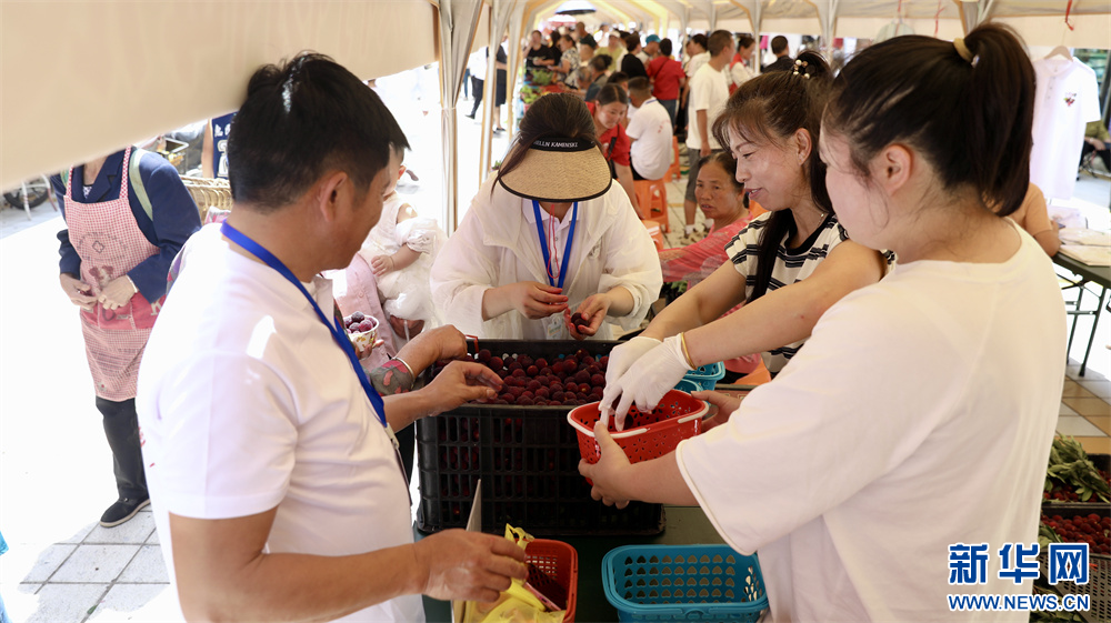 6月1日,罗甸县边阳镇杨梅市集内,游客在挑选杨梅。新华网发(石建生摄)
