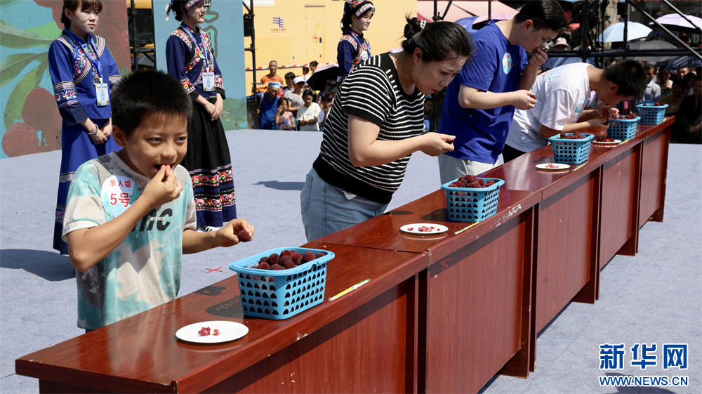 6月1日,在杨梅亲子趣味运动汇现场,游客参加吃杨梅比赛。新华网发(石建生摄)