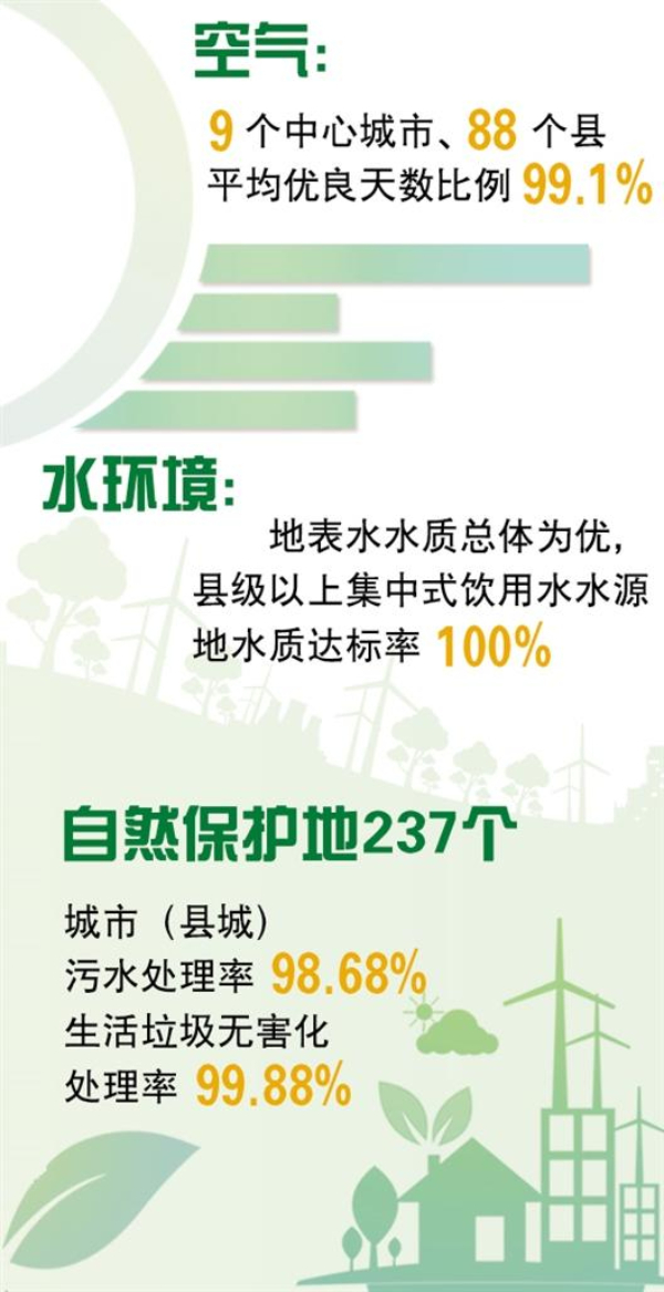 生态环境质量总体保持优良。2024年,9个中心城市、88个县环境空气质量达二级标准,平均优良天数比例99.1%;全省地表水水质总体为优,主要河流222个监测断面水质优良率99.1%,23个出境断面水质优良率达100%,县级以上集中式饮用水水源地水质达标率保持100%;9个中心城市区域昼间平均等效声级53.7分贝,功能区声环境昼间监测点次达标率97.7%,夜间监测点次达标率平均为92.0%;全省生态质量指数70.37,生态质量为一类,生态质量保持稳定;全省环境电离辐射水平处于本底涨落范围内。