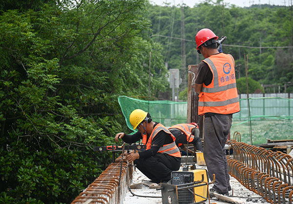 在施工现场,15名工人分组在桥面施工,当前主要是在安装护栏,及为接下来的桥面钢筋铺装和浇筑混凝土做好准备。