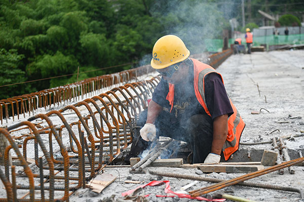 6月4日,位于松桃苗族自治县木树镇的虎渡口大桥危桥改造工程进入最后冲刺阶段,工人在桥面施工。(谢慧芳 摄)