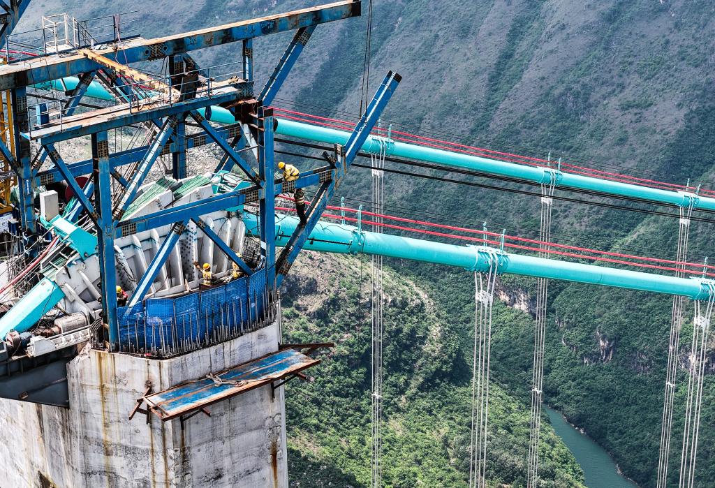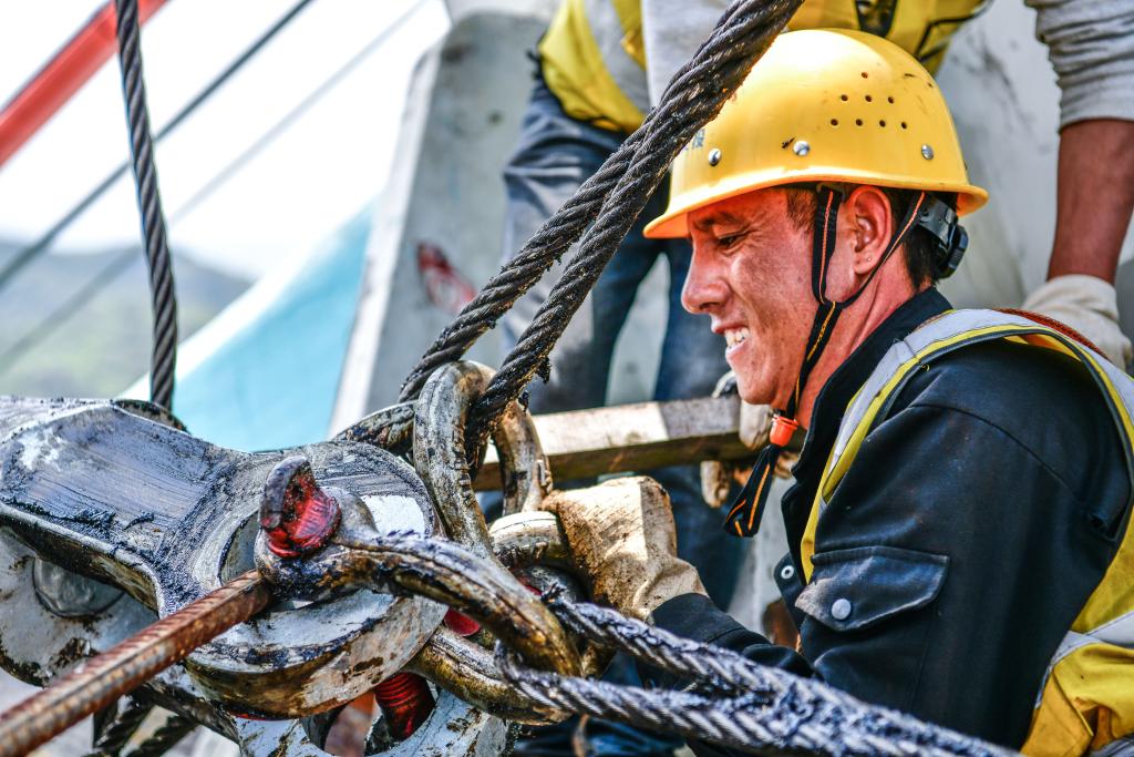 6月6日,工人在贵州花江峡谷大桥上施工。