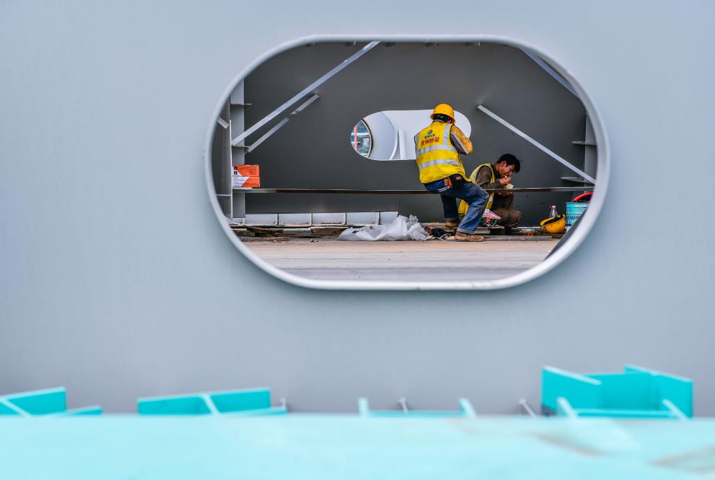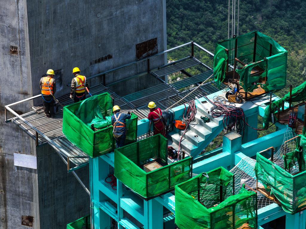 6月5日,工人在贵州花江峡谷大桥上安装观光电梯(无人机照片)。