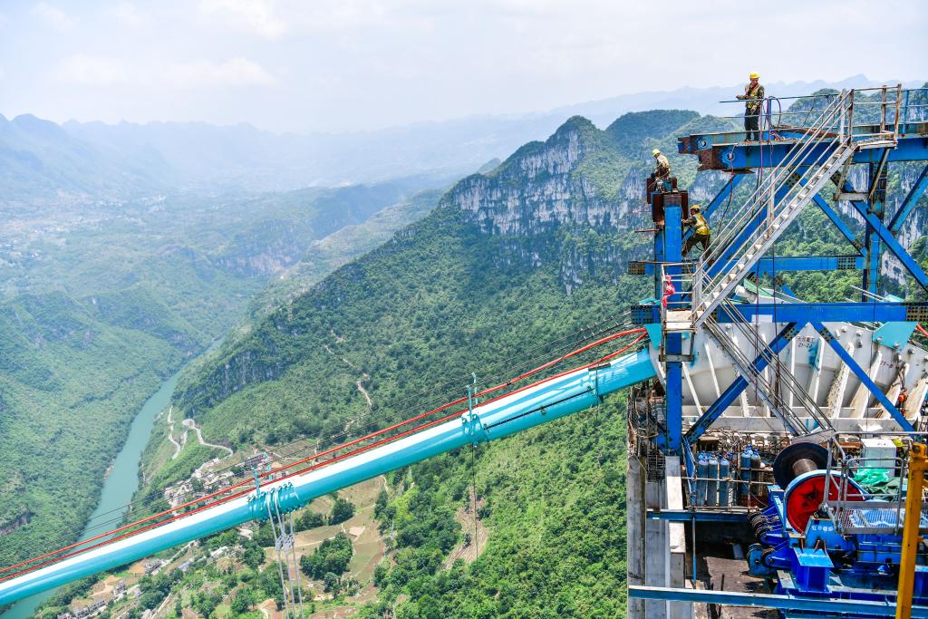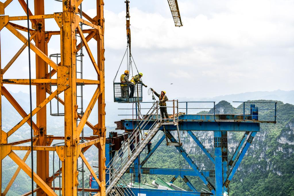 6月6日,工人在贵州花江峡谷大桥桥塔顶上施工。