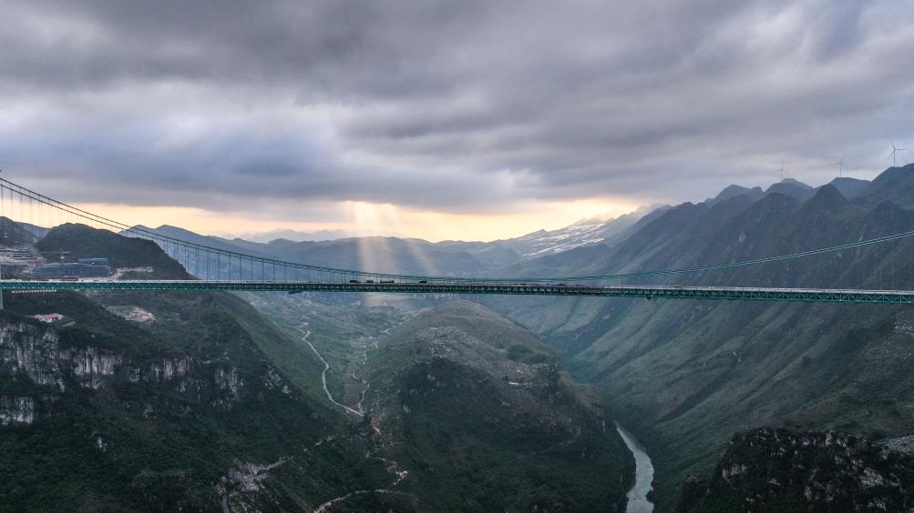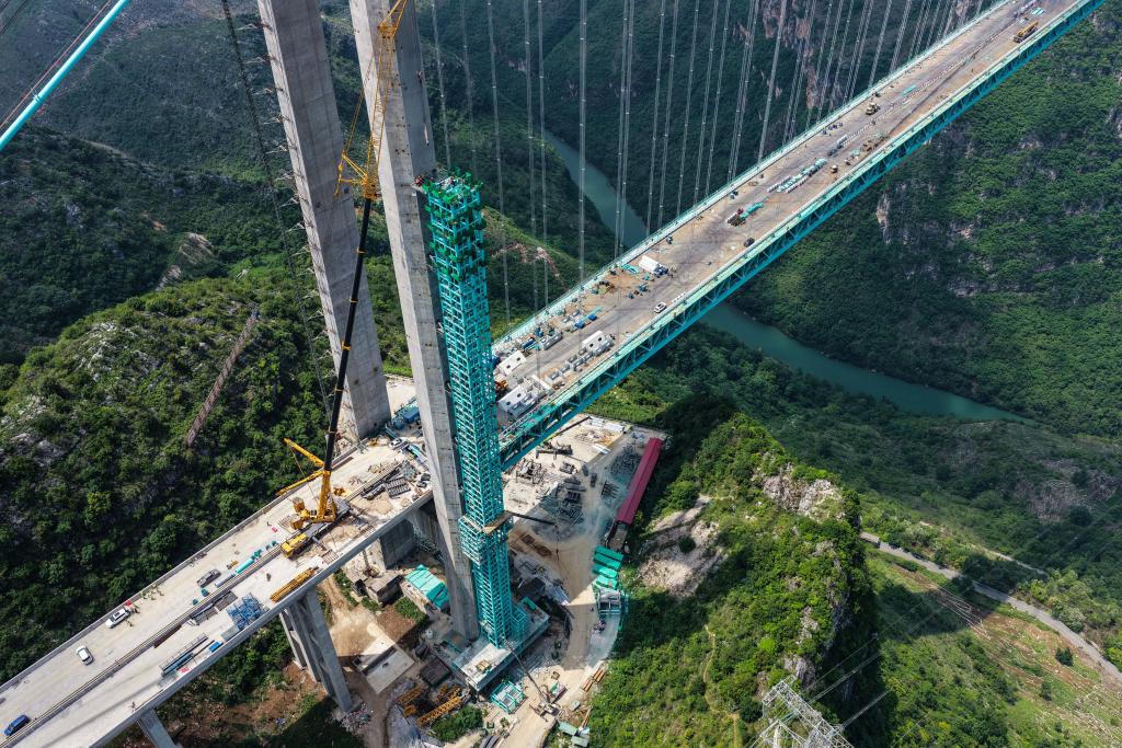 花江峡谷大桥是贵州六安高速公路的控制性工程,全长2890米、桥面距水面高625米,预计今年下半年建成。大桥建成后,将成为世界第一高桥,擦亮中国基建新名片。