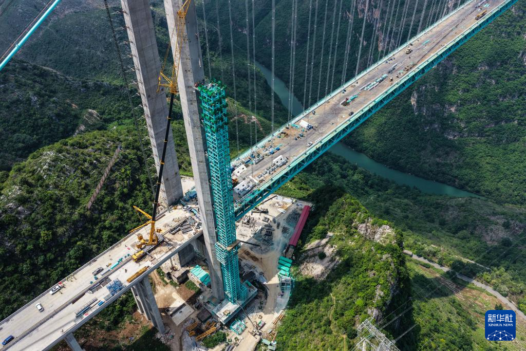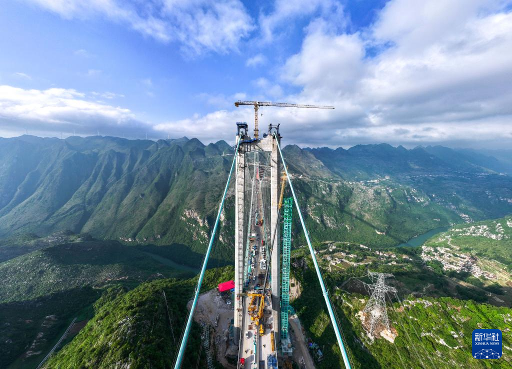 6月6日,工人在贵州花江峡谷大桥桥塔顶上施工(无人机照片)。新华社记者 杨文斌 摄
