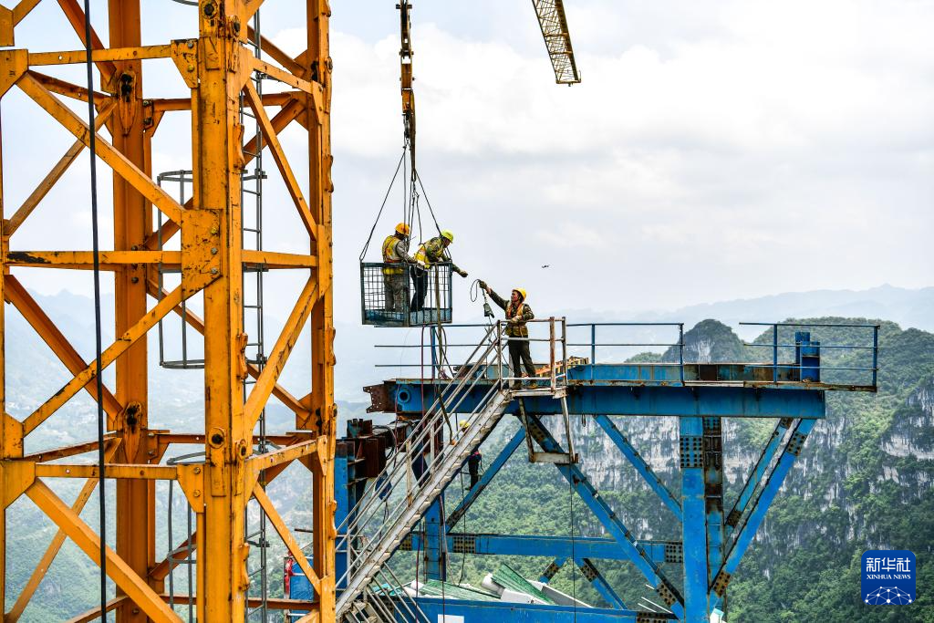 6月6日,工人在贵州花江峡谷大桥桥塔顶上施工。新华社记者 杨文斌 摄