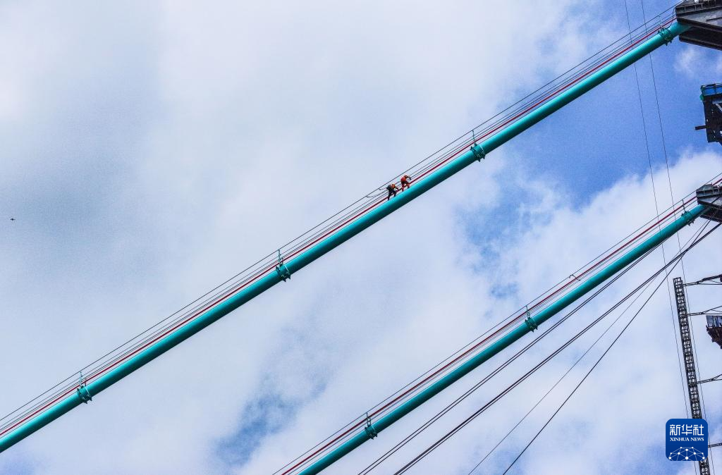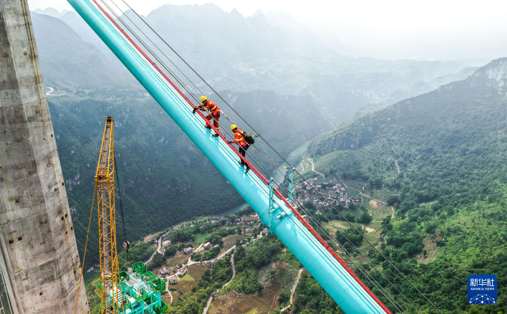 6月6日,工人在贵州花江峡谷大桥主缆上施工(无人机照片)。新华社记者 杨文斌 摄