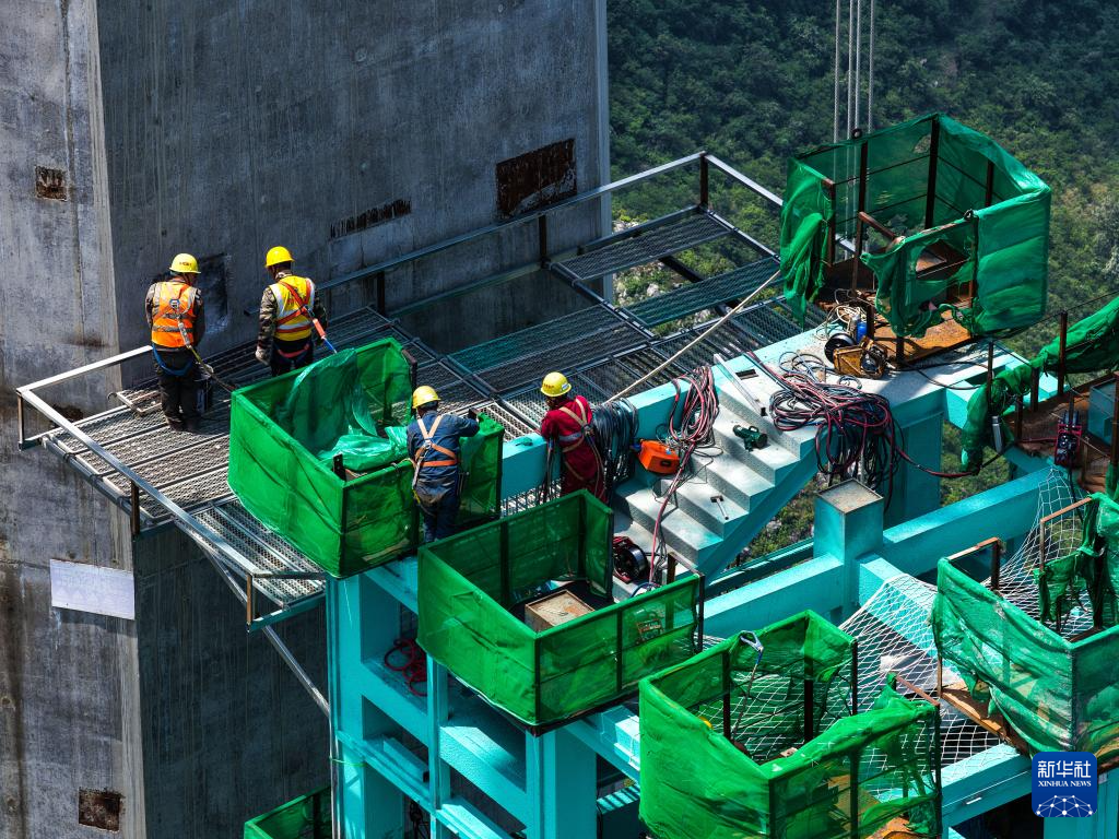 这是6月6日拍摄的贵州花江峡谷大桥观光电梯安装现场(无人机照片)。新华社记者 杨文斌 摄