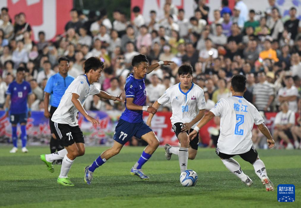 2023年6月23日,贵州省榕江县足球队球员在与青海省果洛州格萨尔王足球队的友谊赛中拼抢。新华社记者 杨文斌 摄