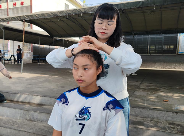 任艳为队员扎“小辫子”。