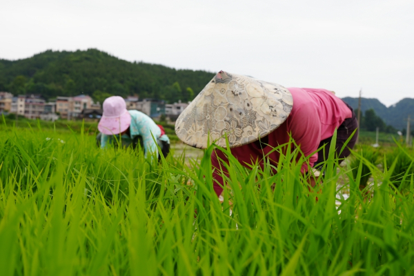 岑巩县羊桥土家族乡龙湾坝区,村民在起秧。(陈昆 摄)