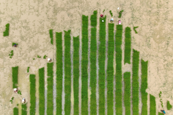 夏风轻拂,贵州省岑巩县羊桥土家族乡的龙湾坝区,蜿蜒的水渠如银带般贯穿田垄,村民们俯身起秧、移栽秧苗的身影,在粼粼水田间连成流动的风景线,为田野织就新生的脉络,传递着丰收的希望。